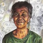 ‘Old Fruit Vendor Lady in Yogyakarta’ is a take on the colorful depiction of an elderly female vendor in a traditional market in Central Java, Indonesia. In the area, traditional market is a place where elderly ladies—often older than 60 years, still work, as sellers of a variety of items, including fruits, vegetables, foods (snacks) and even clothing items. The lady depicted here symbolizes a woman’s strength years beyond her youth; from her fragile frame and smile to the lines on her elderly face. While there are numerous creases on her face from living as long as she has, with a seemingly meek smile, she does not appear to be slowing down in her daily routine of selling fruits. What the artist also wants to feature is the attire the old lady vendor wears. Although the top part of her outfit consists of a bright green t-shirt, she still wears a traditional sarong—or a wrap fabric around her tiny waste. The sarong features a specific pattern, called batik, native to the area of Central Java. The combination of modern and traditional attire provides a unique sense of progress and tradition in her assumed life.