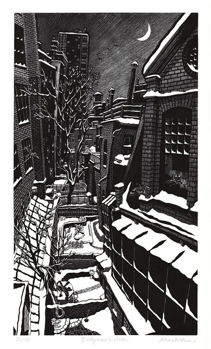 From 2010 to 2016, Karen and her husband directed their own gallery in Woodstock, exhibiting their own work and that of 7 other contemporary printmakers. Their emphasis was on educating the public about the art of the print, giving frequent talks and demonstrations about the techniques and aesthetics of the hand-pulled print. They vacated the building when it was sold in 2016, but Karen continues to teach periodic weekly classes and 3-day intensive workshops on the black and white linocut to share her knowledge of and enthusiasm for the medium with her students at The Woodstock School of Art.