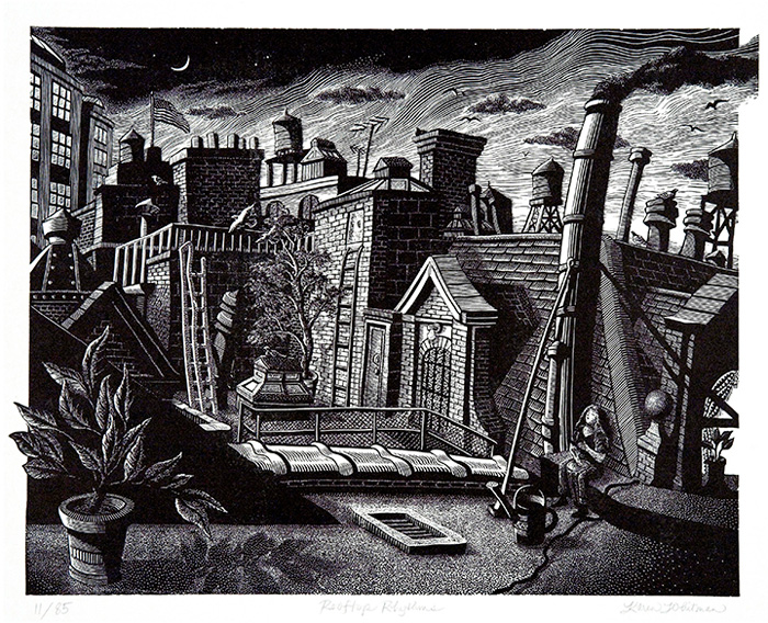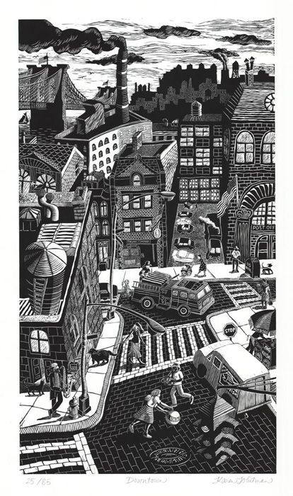 In addition to the images I draw entirely from life, there are those I invent completely. There are also those that are a combination of the two, offering something more than the sources that inspired them. The prints are narrative in quality and often include people interacting with their environments to create a world and tell a story with contrasting patterns and textures, leading the eye from one vignette to another, each telling its own tale of the urban experience. The viewer is invited to participate in and invent the story that is suggested to them personally, by that print’s captured moment.